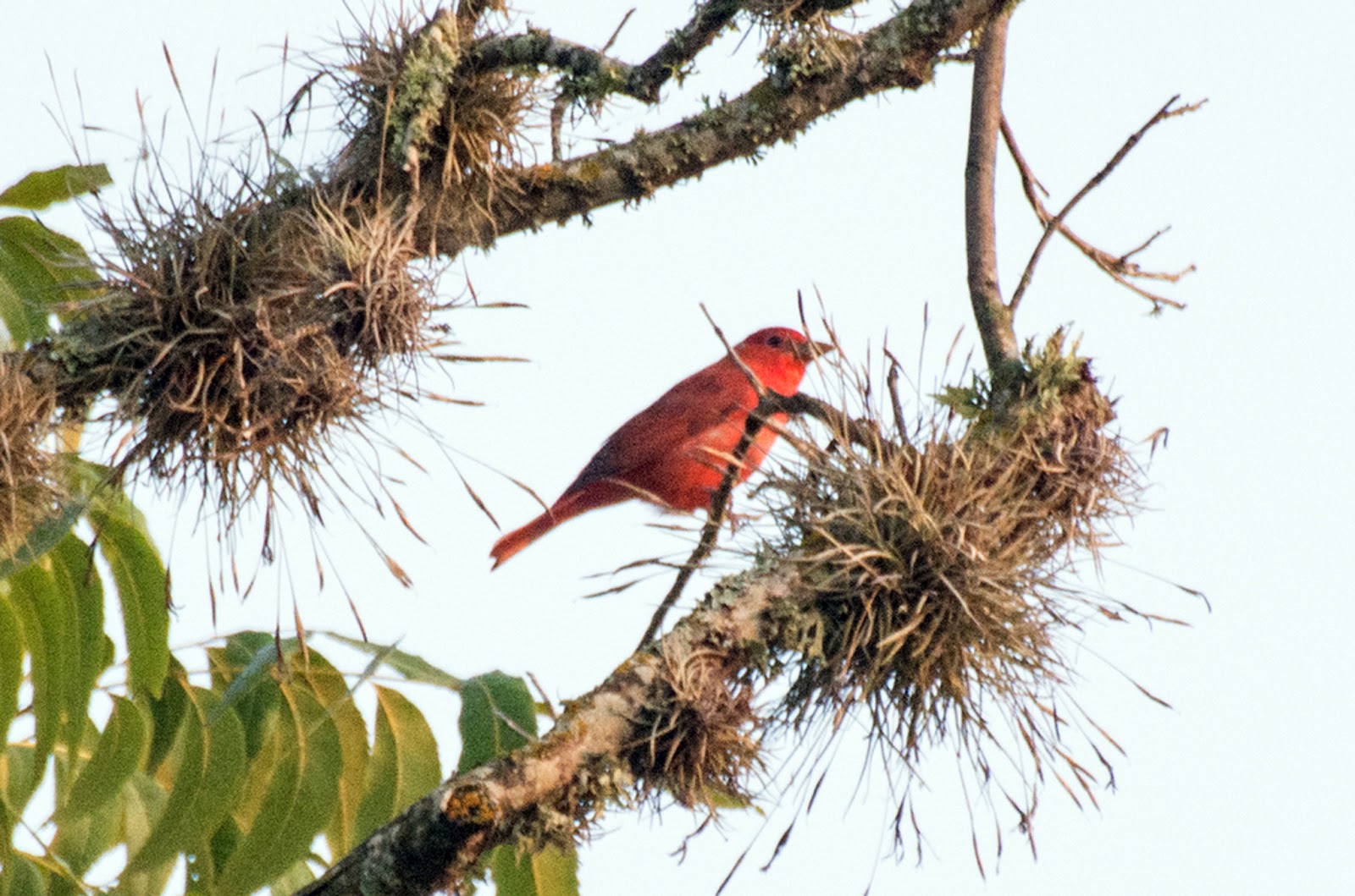 Saturday’s hike was rewarded with a close-up view of a Great Blue Heron flying low over the lake. Four Wood Ducks with their colorful markings took flight as we closed-in for the better look. Unfazed were the vultures roosting in the top of a nearby tree. Also unfazed and singing but sitting still for photos was the Summer Tanager. No confusing this one with the common American cardinal; the differences were apparent.