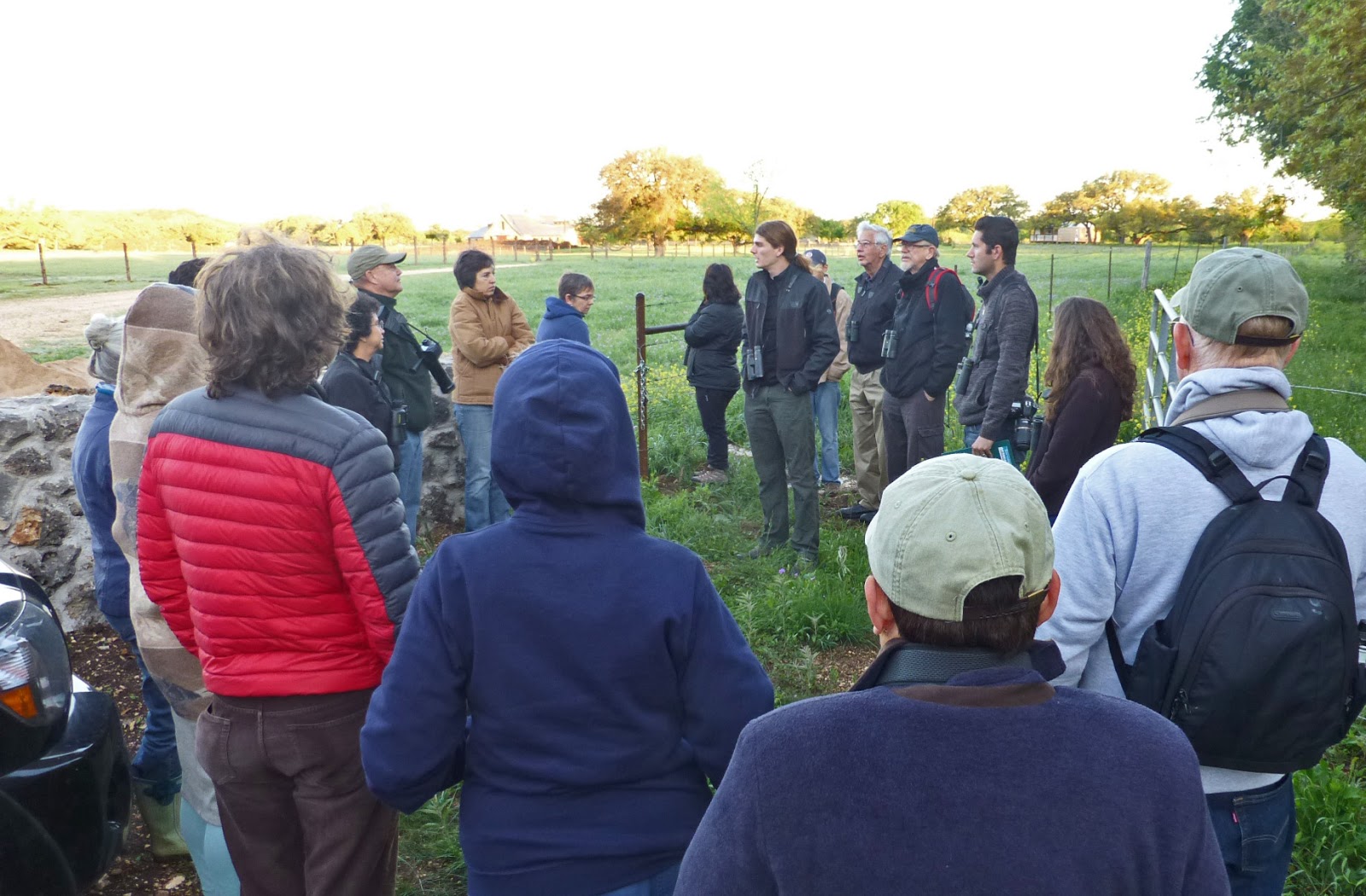 When it comes to variety of species in bird walks one location sure to please is the property owned by the San Marcos River Foundation off Lime Kiln Road. Although the temperature was in the low-to-mid 40’s and the ground was wet, the viewing was grand. We saw 38 different species compared to last year’s 35. Other locations range in the 20-30 species depending on the availability of a water feature.
