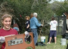 Over 30 people turned out for Bobcat Build on a beautiful April morning. We all made our way to the trash pile left by previous land owners in upper Purgatory Creek Greenspace and began the process of deconstructing the pile. We cut and pulled away the fence along with some vines and a few branches. Analysis was part of the process in that the necessity to separate materials for recycling required a closer look. (It’s a good idea anyway when you know snakes and other critters are a possibility.) It also meant finding the occasional odd piece of history ranging from an old credit card to weird bottles. By the time our work session was over, only a small pile was left to be scooped up with shovels and bagged.