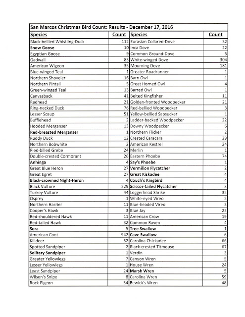 Before the sun was up on Saturday, December 17th, birders were meeting to start the annual Christmas Bird Count in the greater San Marcos area.  Although the forecast called for a chilly morning turning warm in the afternoon the drizzly rain was a surprise. This might put a damper on the birds but the binocular and scope group was ready to search.