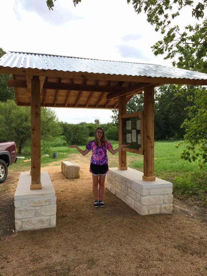 The Blanco Shoals greenspace now has a very welcoming entry kiosk to invite hikers into the park. The kiosk was designed and built by Lindsey Diann Burton, daughter of Scott and Gwen Burton, as her Girl Scout Gold Award project. Lindsey partnered with the San Marcos Greenbelt Alliance and the city of San Marcos to make this park more appealing and noticeable to the public. The kiosk contains a bulletin board which will contain information about the park and a map of the trails. Lindsey is a graduate of San Marcos high school and a member of Girl Scout troop 881. She is grateful for the encouragement of her Girl Scout leaders, Janice McMain and Gwen Burton. Her project advisor was Maggie Hutchins of the San Marcos Greenbelt Alliance. She is grateful for the assistance of expert carpenter Armando Contreras, and the many friends and family who helped make this vision a reality.
