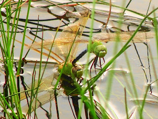 I don’t know which species the dragonflies are; maybe someone else can tell me. I love the way their golden wings are reflected in the water. In the photo, a little golden rainbow can be seen arcing over the water toward the egg site, as if to bless or vitalize this new birth.