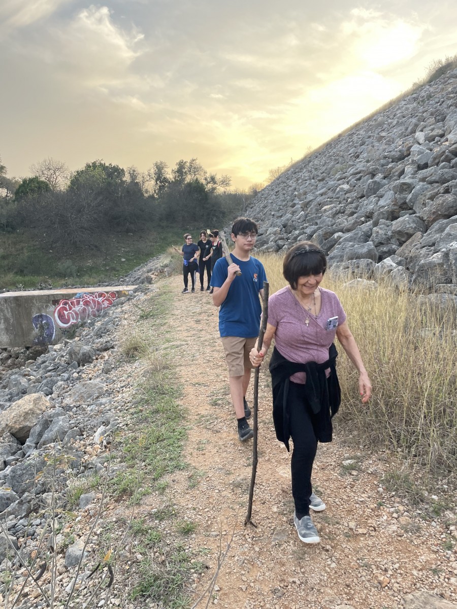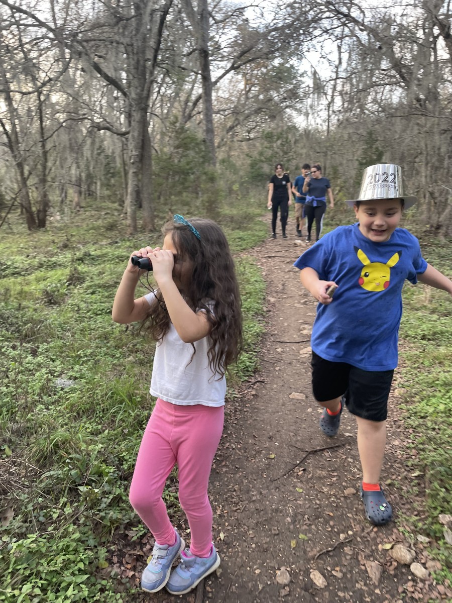 During the walk, we observed juniper groves and cacti, and picked a few chile pequins along the way. We noticed different bugs and insects on the trail and found a small animal habitat within the rocky terrain. Each of us guessed the type of animal that might be taking shelter there—A snake? Armadillo? Coyote? Fox? Skunk? The kids also used their binoculars to look at the various birds. My favorite moment was when, with the sun setting, they all looked into a rock pit, lifted their hands, and shouted “Happy New Year!!,” breaking the peace of the trails for a moment.