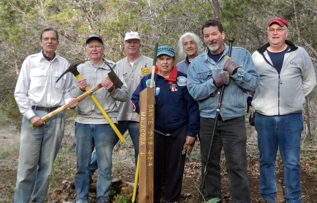 The first of several directional and distance markers were placed in Purgatory Creek Natural Area on December 1, 2011 by the Thursday morning trail crew. The Malacoda spur trail leads to a very impressive grotto showing the force water can have on the limestone. Distance markers to the trail head are engraved on the post. Additional markers at key intersections will be placed in the coming months. Pictured (L. to R.) Todd Derkacz, Dick McBride, Mark Taylor, Marilyn Brister, Donna Browning, Paul Murray and Lance Jones. Not shown: Charlie O’Neil, Sheila Torres-Blank, Mike Baugh and John Payne.)