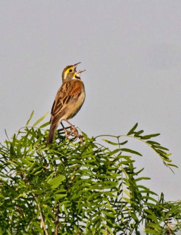 Led by Stephen Ramirez and assisted by Colton Robbins, who provided the list and several of the photos, the hike lasted a little over one-and-a-half hours. Dew covered much of the grasses and the early morning sun provided dramatic lighting. Highlights of the birding included a juvenile Red-tailed hawk perched on a high post in the middle of the field. Two Black-bellied Whistling Ducks flying together directly overhead our group. And most photographed, Dickcissel singing away atop a mesquite tree. They were almost as abundant as the doves.