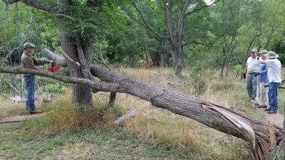 Downed Chinaberry tree tackled by SMGA trail crew. Trail crew Thursday, the third week in June, saw (pun intended)