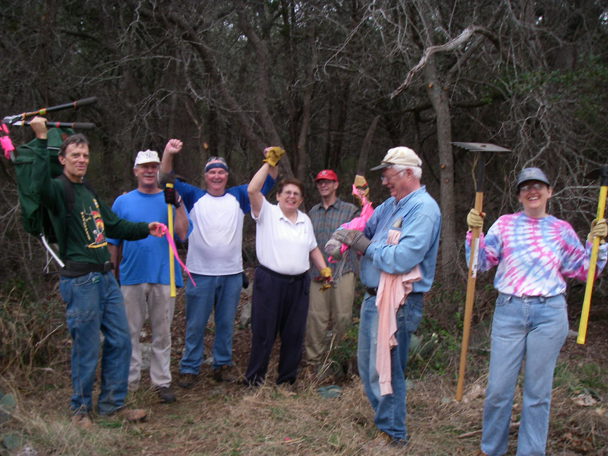 A new section of trail between the view of the dam and the bluff over Purgatory Creek is open to offer hikers a way off the straight, open meadow trail and into a shaded world of cool comfort. The 1/3 mile re-route was completed February 24th from the efforts of the Thursday morning crew. The change from open meadow grassland to live oak, ashe juniper and persimmon woodlands will make all the difference during the hot summer months.