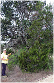 A row of bois d’arc or osage orange trees follow the trail to the Learning Tree. It looks promising that the seven trees will take hold and provide shade from the summer sun. An ashe juniper tree is surrounded by a dozen different plants and adds to the knowledge database.