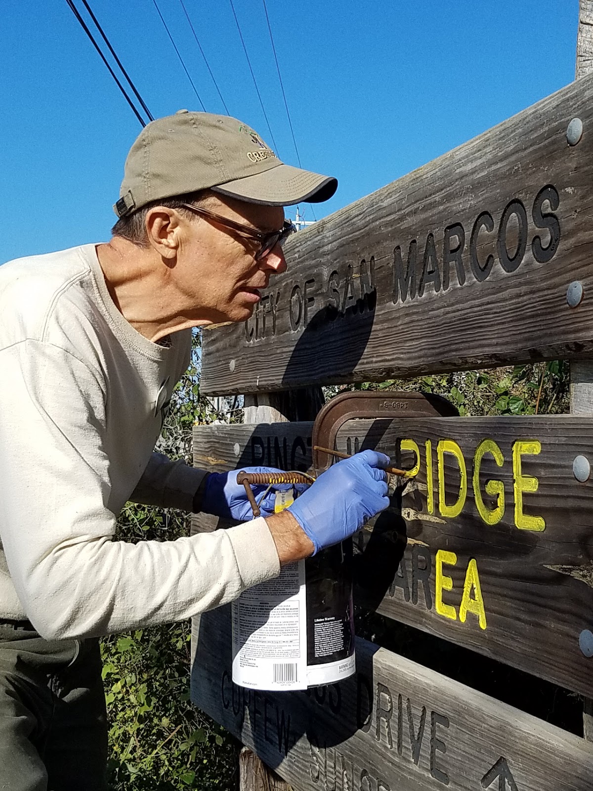 Saturday’s trail crew planted two new Texas Mulberry trees to the 45-acre natural area. A lantana was also planted at the entrance although the deer quickly found the unprotected planting. The crew also lopped and string-trimmed around Tex’s Trail. Todd began the job of hand-lettering the entrance sign with yellow paint.