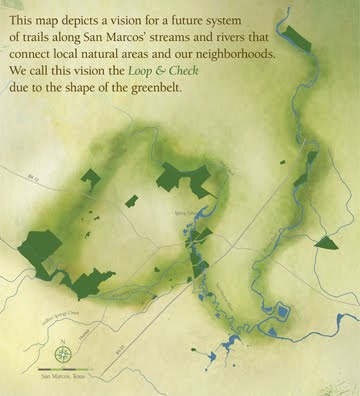 SMGA helps fill the deficit one might perceive in the master plan with a clear proposal that we generally refer to as the Loop & Check (http://www.smgreenbelt.org/About.htm). We advocate connecting existing natural areas and parks with a greenbelt trail system that supports healthy recreation and at the same time protects creeks, water recharge zones and floodplains. Protected corridors keep our natural areas biologically diverse and help keep our community healthy, providing clean air and water, educational opportunities, and beauty. A robust greenbelt system will make us the envy of neighboring communities, help sustain our economic vitality, and position us to connect to the regional trail system rapidly taking shape in northeastern Hays County with the Violet Crown Trail.