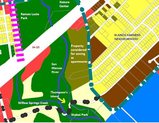 PLEASE ATTEND: 6 P.M. Tuesday evening, City Hall, Planning and Zoning Commission meeting. Blanco Gardens neighborhood rep Angie Ramirez will speak, along with several others, in the citizen comment period at the very beginning of the meeting re the need for a riverside park east of IH 35 to connect our very crowded and worn river parks with the east side of IH 35. There is a lot of state and city owned land there beyond Stokes Park that would create a big swath of riverside park if it were only connected. But instead, another apartment project might take the land that could provide this connection, Cape’s Camp. Many of us would rather see a parks bond proposed for November 2013 ballot, and a unified effort to raise funds and grants to make this a park instead of apartments. Please attend, no need for everyone to speak, but the visible support of many citizens will make ALL the difference. Please take time to spread the word to all your friends via Facebook or email, or any way you can tonight or tomorrow. See you at 6 on Tuesday, and here is the agenda packet re other issues that will be heard later that night, if you want to stay: http://www.ci.san-marcos.tx.us/index.aspx?page=827.