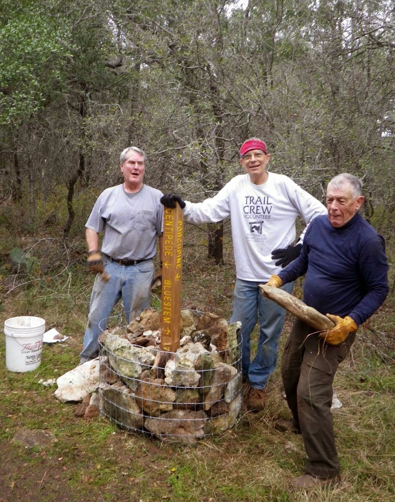 | Joel, Todd and Gordon add more rocks at the intersection of Blue Stem, Porcupine and Centipede trails |