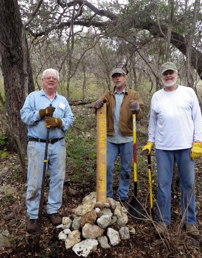 (l. to r.) Charles, Ronnie and Al anchor the marker at the intersection of Centipede and Roadrunner trails |