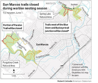 SAN MARCOS — Intent on protecting the tiny endangered songbird that nests only in Central Texas, the City of San Marcos is temporarily closing a handful of trails while the golden-cheeked warblers lay their eggs.
