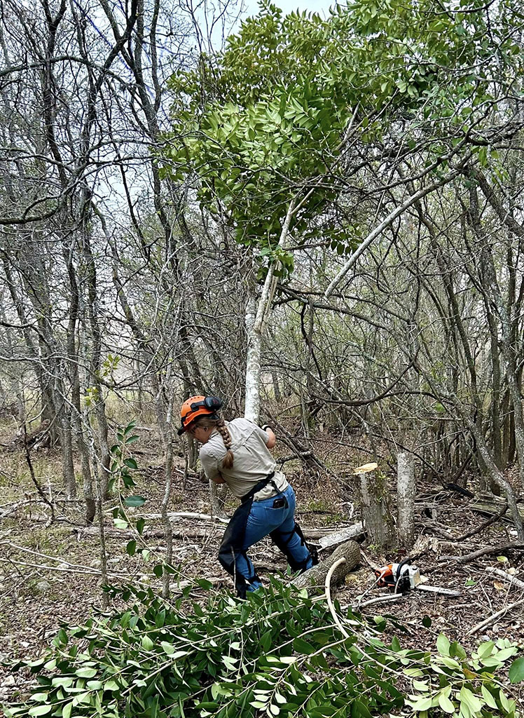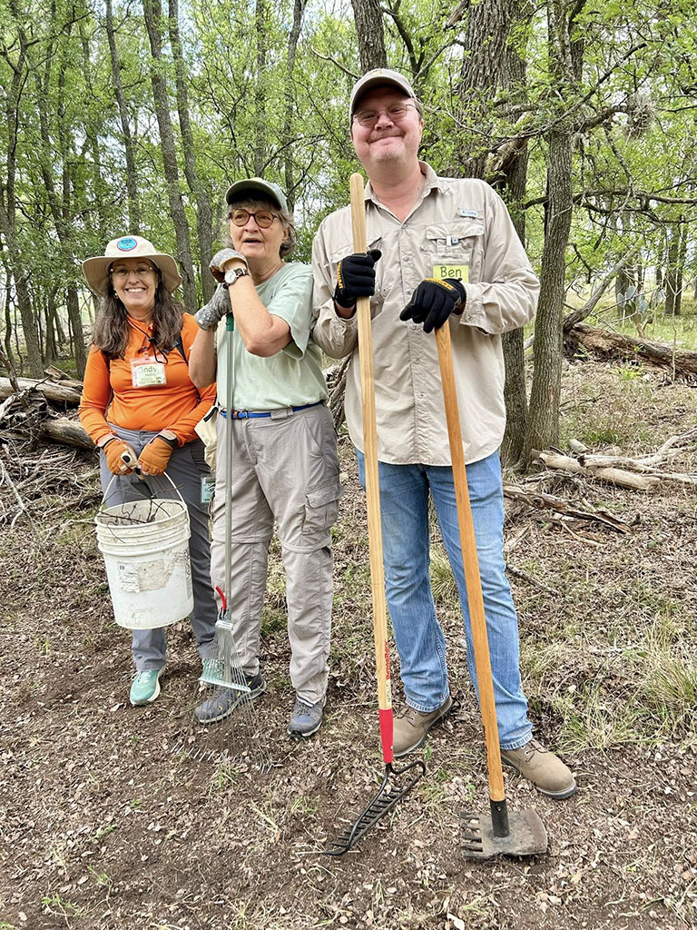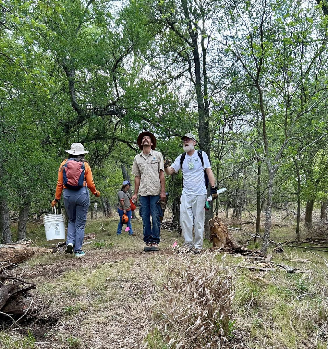 The trail crew spent time prepping the area by collecting trash and removing invasives, mostly ligustrums. The leafy sections of trees were reduced and dispersed while the trunks were used to create berms parallel to the Purgatory Creek bed to reduce bank erosion.