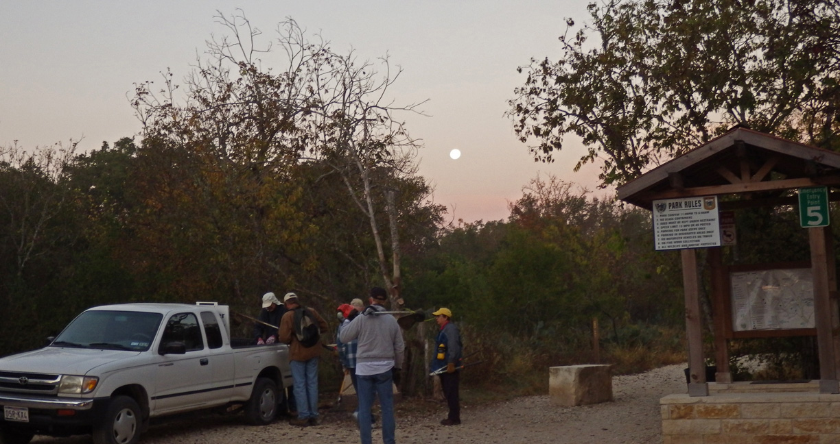 It was a chilly morning as the moon set over Purgatory Creek Natural Area. A few hardy souls anxious to work through the first holiday hurdle of too much good food prepared to improve Dante’s Trail from the Hunter Road trail head. Mostly loping dead branches from drought-stricken trees one group coursed through Nimrod Trail alongside dam #5. Others using weed-wackers cleaned up the overgrown Johnson and KR bluestem grasses. Both are non-native and invasive. Another team scouted a potential alternate trail when floods (rare, they may be) make Dante’s an impassable journey.