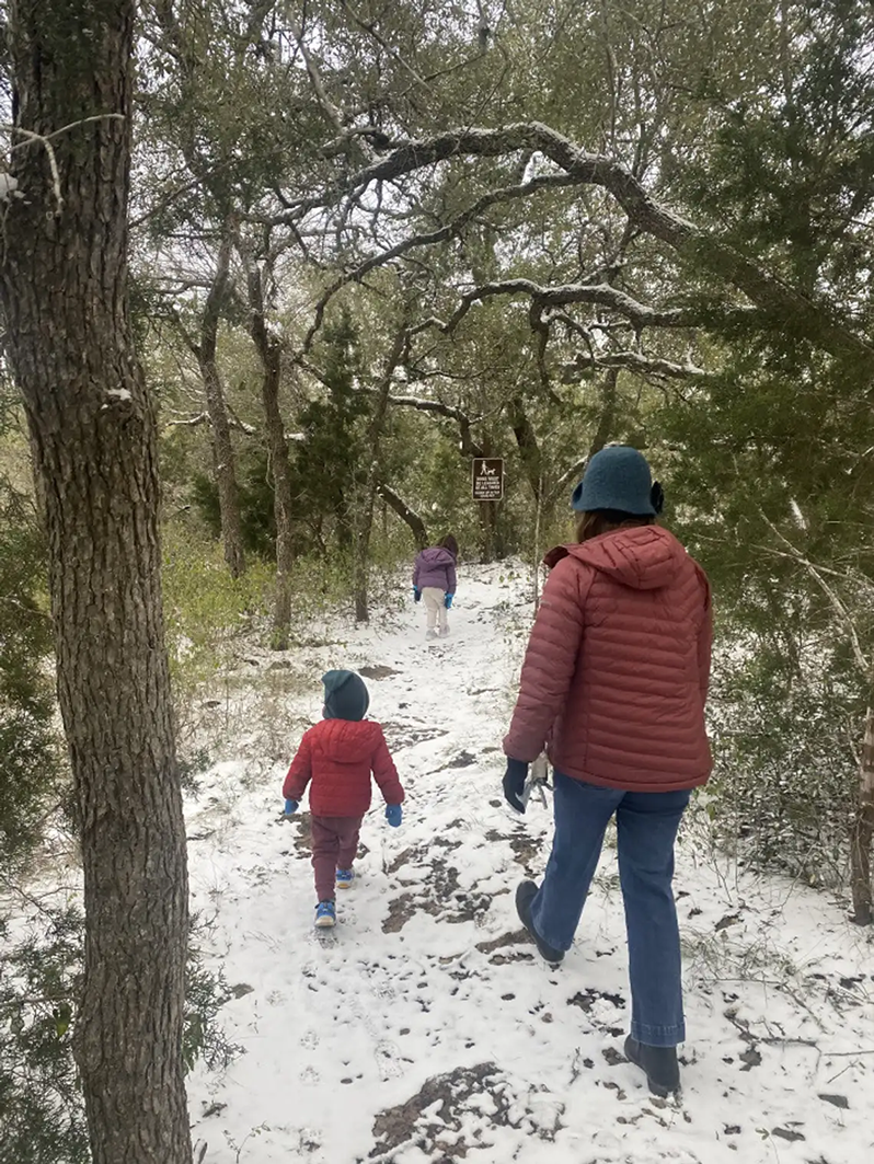Both of those conversations have stuck with me, and in the decades since, I’ve tried to prepare better and cancel less due to weather. One of the unexpected benefits of living into this wisdom was that I frequently got trails to myself in conditions that revealed hidden treasures. It’s hard to say what constitutes bad weather in Texas—heat, cold, flood, drought? We get them all, but as we head into the chillier part of our year, here are a couple of tips on coldweather hiking to keep you out on the trails, discovering the joys of stillness and the beauty of starkness.