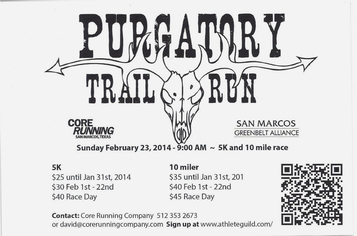 The Purgatory Trail Run sponsored by Core Running of San Marcos is happening on Sunday, February 23 at 9 AM. This event was a blast last year and Dave Moody, owner/operator of Core Running, the shoe store on the square, donated proceeds to SMGA. The race will be a 5K and 10 mile run throughout Purgatory Creek Natural Area beginning at the parking lot on Hunter Road.