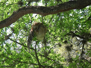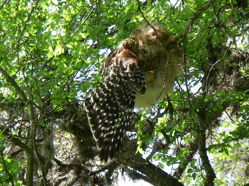 We were working at preventing or at least reducing the erosion on the ADA (Americans with Disabilities Access) trail at Ringtail Ridge, when a Texas State student looked up into the live oaks and elms and noticed a peculiar sight. A red-shouldered hawk met its demise after becoming entangled in the branches. Your comments and hypotheses as to how this might have happened are welcomed and encouraged.