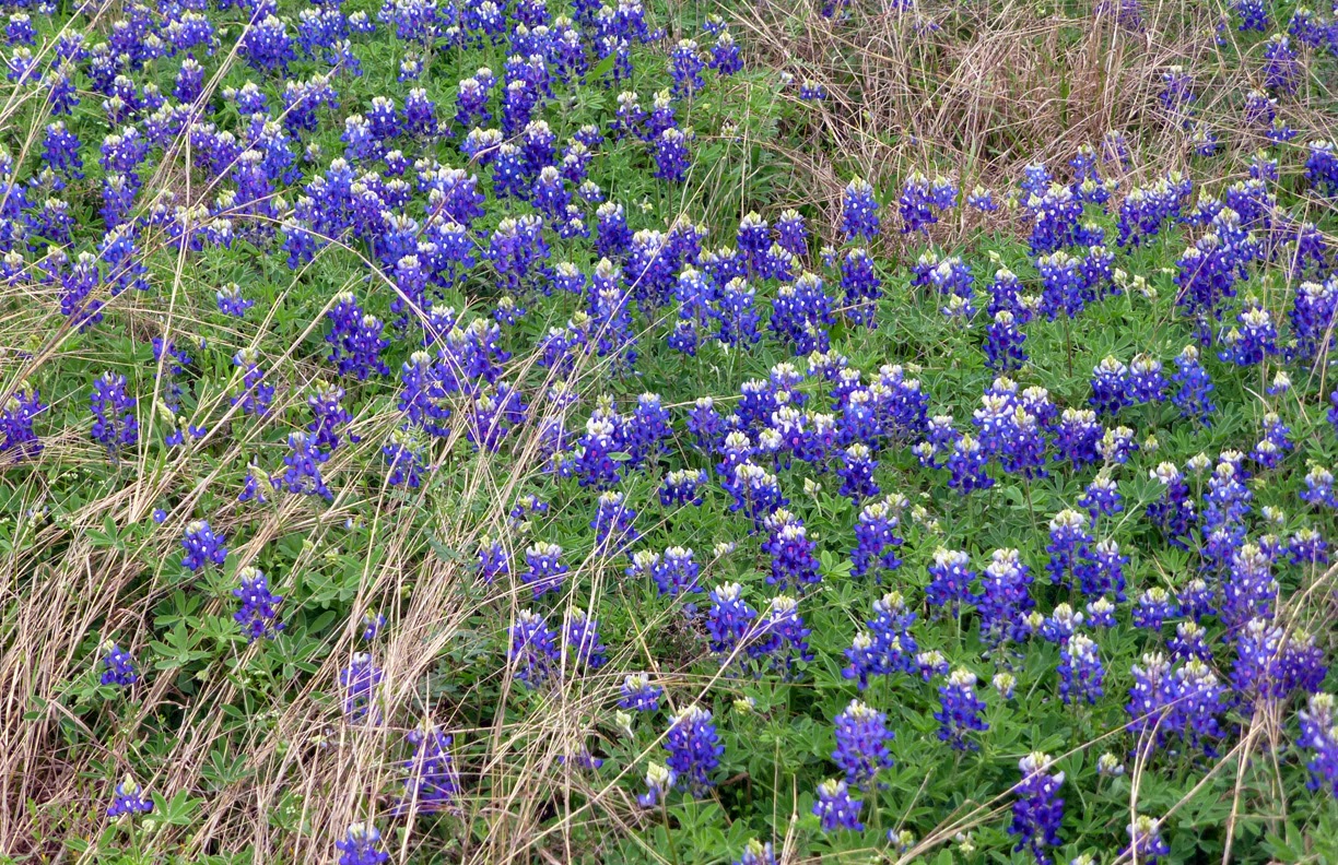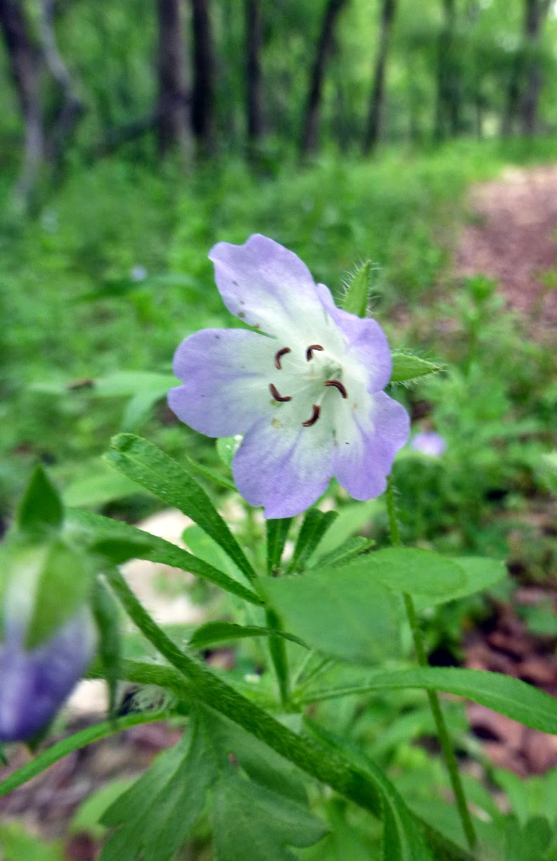 Purgatory Creek Natural Area: Bluebonnets on Limbo Loop (Prospect) and Ripheus Trail. Baby Blue Eyes along